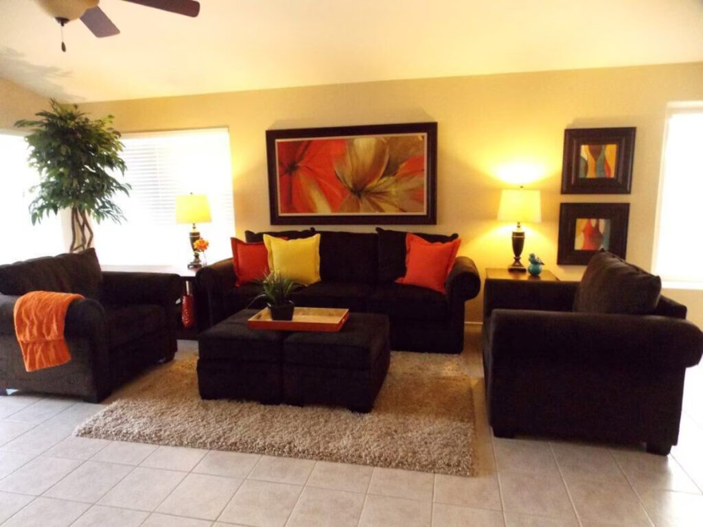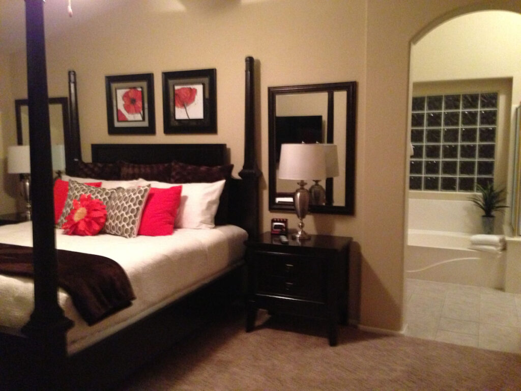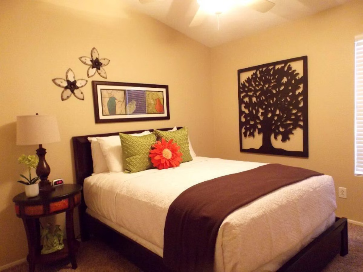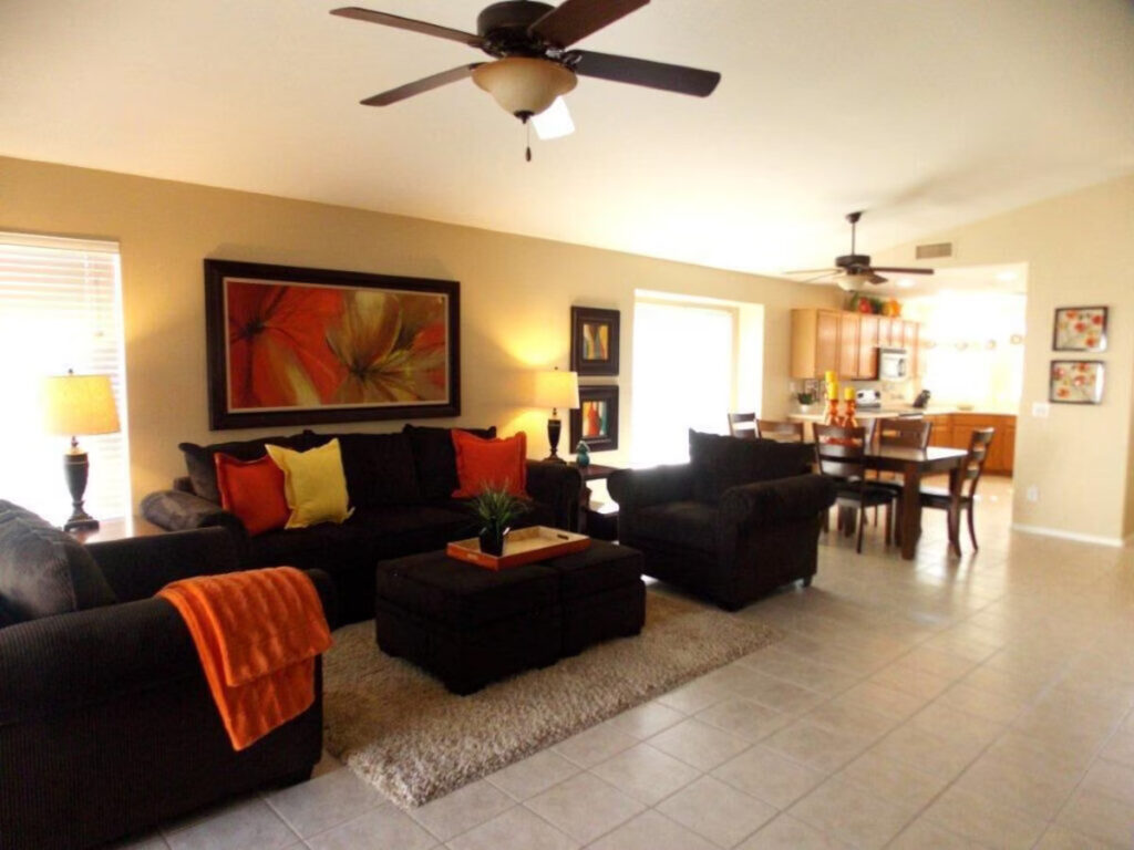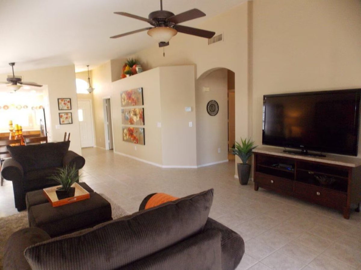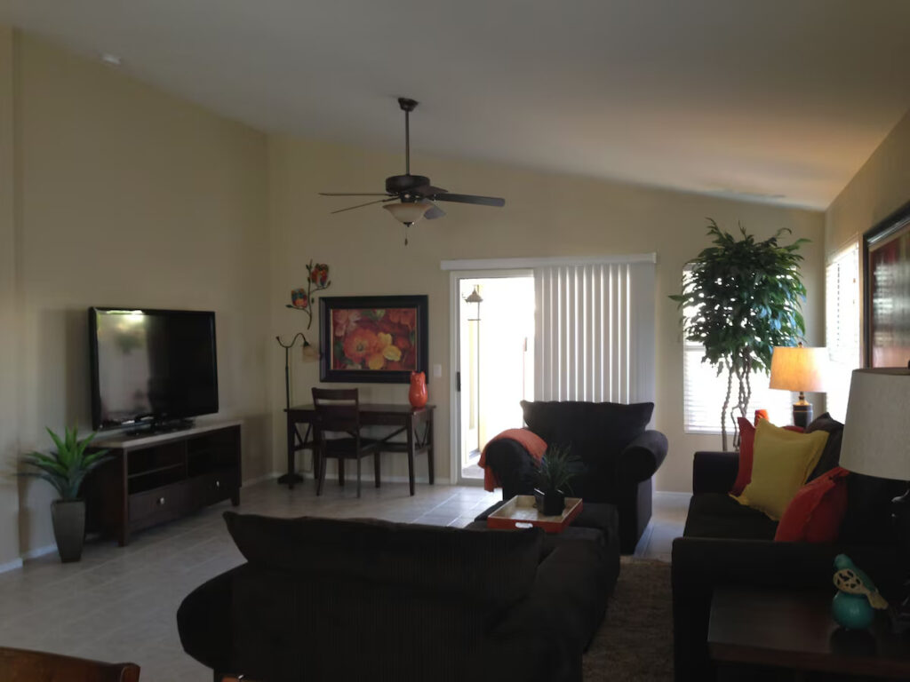 Nothing has been overlooked in this beautiful, professionally decorated home with 3 bedrooms. Complete with the finest linens and furniture throughout for your ultimate comfort. The master bedroom offers a plush king poster bed, 50′ LCD TV, and an extra-large master bathroom with a private toilet room. The two additional bedrooms have plush queen mattresses and shelved closets to meet your needs. This home is equipped with cable television and has a 60′ HDTV flat panel television in the living area. High-speed wireless internet is free of charge, and a work area is available for your convenience. The kitchen is fully equipped with dishware, cookware, a large pantry, and stainless-steel appliances. The dining table seats up to 8. There is a 2 car garage, laundry room, fenced private backyard with a pool with the option to heat at an extra charge. The grassy area and covered patio are equipped with a gas grill. The home is open to a beautiful green area and park literally outside your kitchen window. Equipped with doggie parks, tennis courts, basketball courts, playgrounds, and walking trails. All linens are provided, including pool towels. This home is perfect for golfers, located near multiple golf courses, and even has a 5-star golf course within 20 minutes. Its wonderful location is 10 minutes from the Peoria Sports Complex (Training Center for Padres & Mariners) and Entertainment Row, including the Arrowhead Mall, Spa’s, Restaurants, and Movie Theatres! 10 min further is both the State Farm Stadium (home to the Arizona Cardinals) and the Desert Diamond Arena. Both are located at Westgate, which also houses much exciting nightlife. It’s the perfect oasis and great for biking, walking, and jogging along our New River Trail just minutes east of our property. We’ve covered all the details so you can enjoy your stay and feel at home.